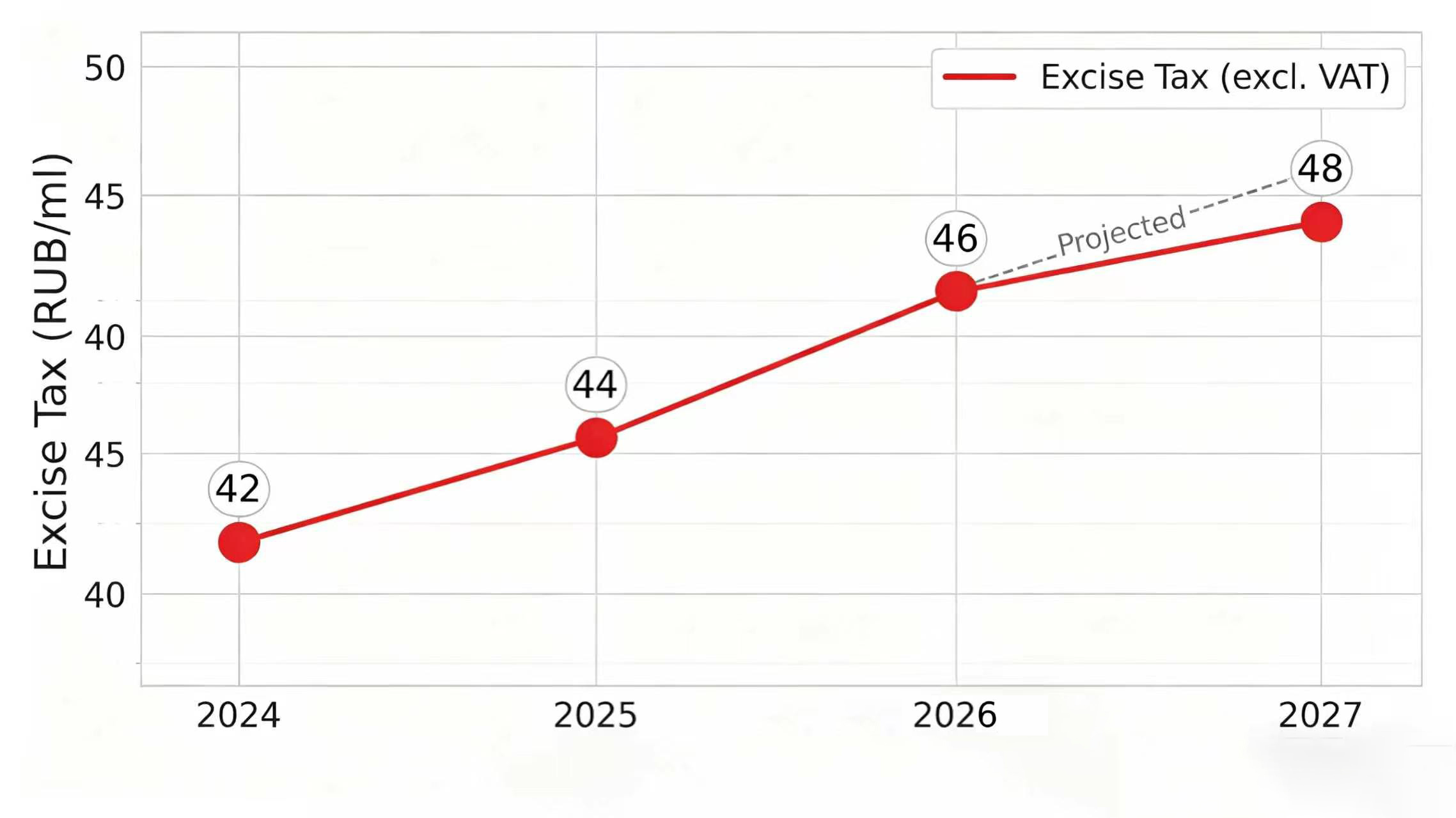 在税收层面,电子烟油消费税持续上调,从2024年的42卢布/ml提升至2026年的46卢布/ml,并计划在2027年进一步上调至48卢布/ml,同时叠加20%的增值税,对合规产品成本形成持续压力。